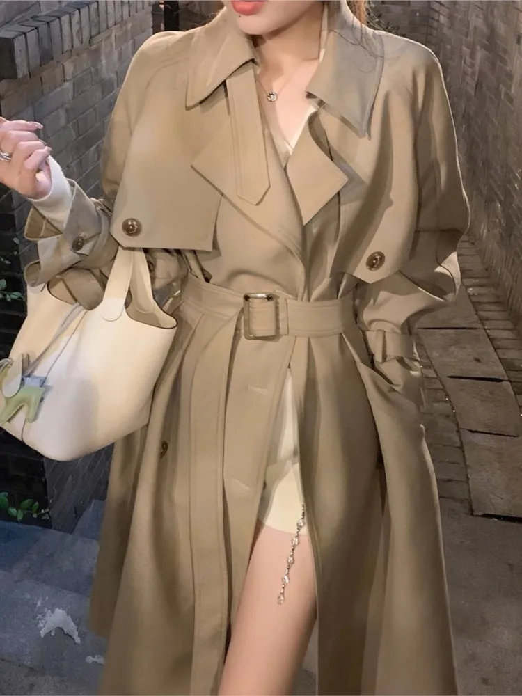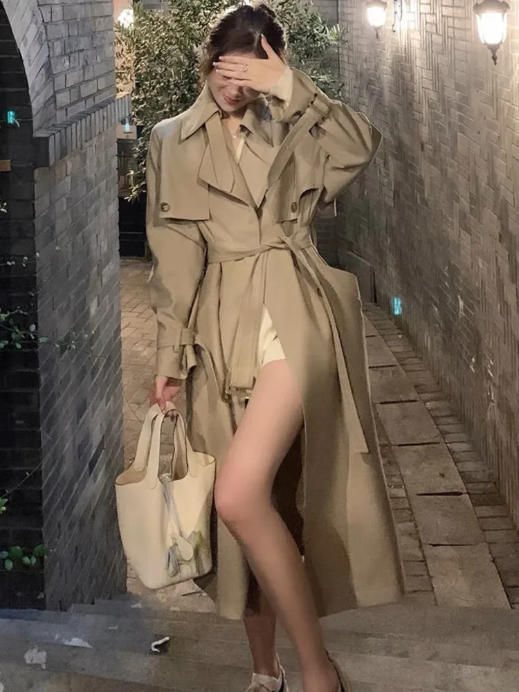 Autumn Winter Khaki Long Trench Coat for Women 2024 Jacket Elegant Outerwear Turn-down Collar Tie Belt Korean Chic Windbreaker