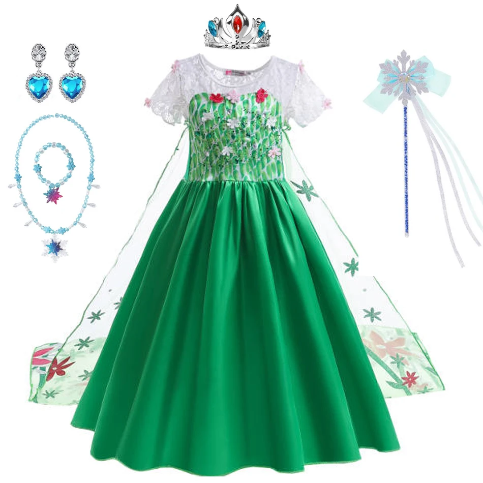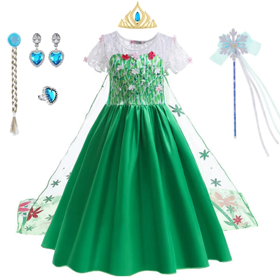 Elsa Green Dress for Kids Girl Princess Costume Dresses Children Long Cloak Floral Lace Ball Gown SummerElsa Green Dress for Kids Girl Princess Costume Dresses Children Long Cloak Floral Lace Ball Gown Summer