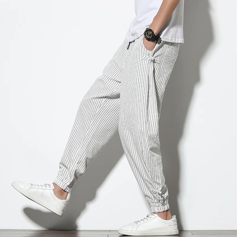 Chinese Style Summer Men Thin Striped Harem Pants Breathable Cotton Linen Pencil Pants Buckle Casual Bloomers Fashion Trousers