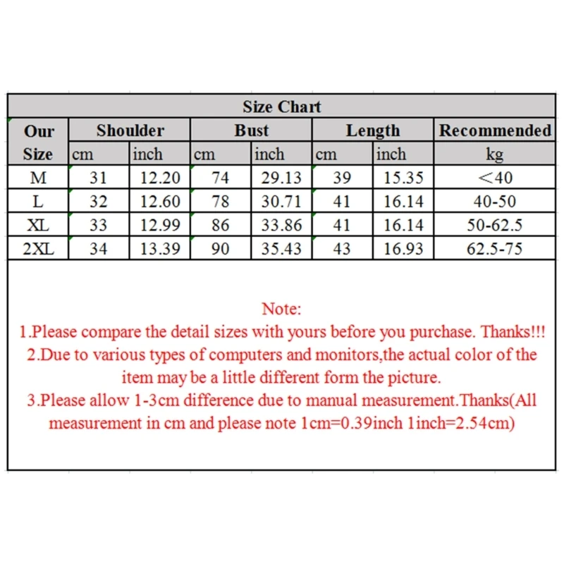 Size:M Shoulder:31cm(12.21inch) Bust:74cm(29.13inch) Length:39cm(15.35inch) Recommended Weight:<40kg