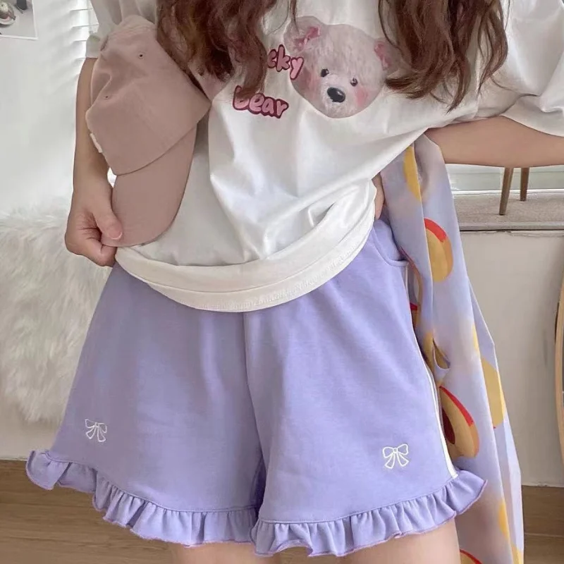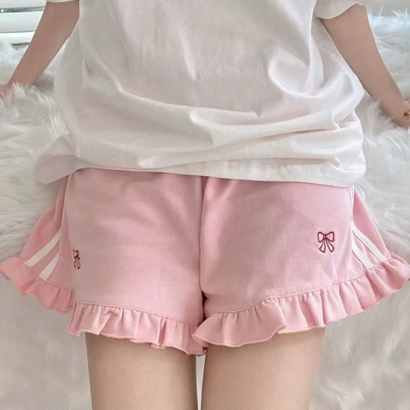 Sporty Shorts Women Ruffles Kawaii Bows Japanese Style Casual Loose Soft High Waist Summer Students Simple Fashion Popular Chic